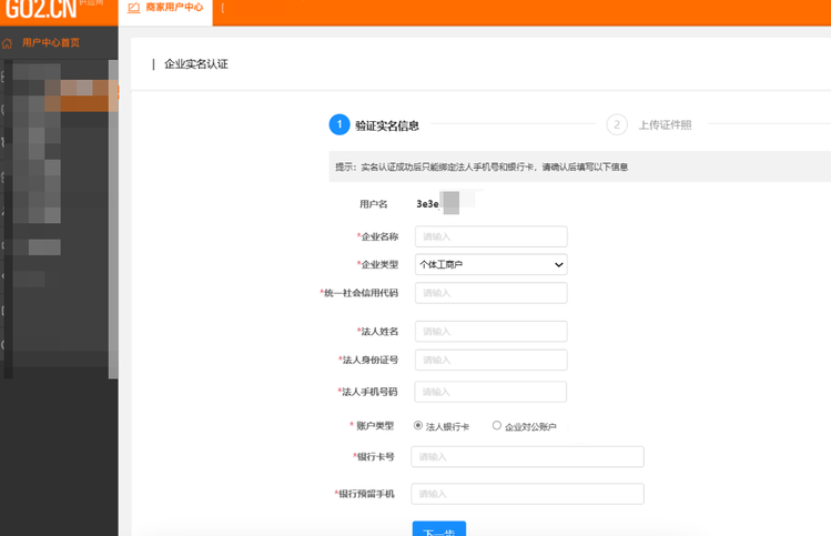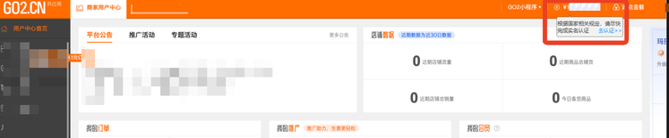 1)路径:【商家用户中心】->【账户管理】->【去认证】