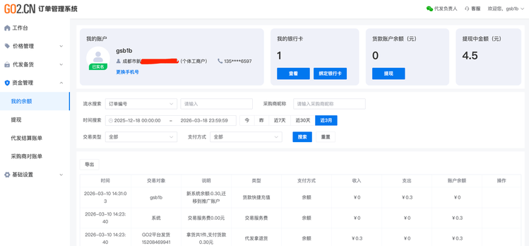 实名认证且绑定手机号和银行卡后,厂家可申请提现。提现申请提交后到账时间为T + 1个工作日(需通过财务审核)。每日首笔提现申请免手续费,超出部分每笔收取0.5元手续费。操作步骤如下: