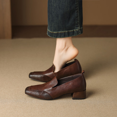 粗跟方头擦色真皮短靴