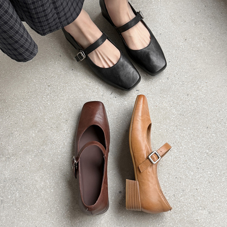 内增高系带镂空方头猪鼻巴蕾鞋