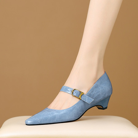 粗跟尖头一字带复古擦色水洗牛皮单鞋大码34-42
