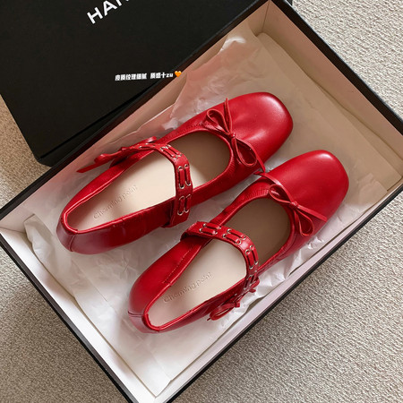 小红书爆款~安可拉红一字带圆头粗跟浅口芭蕾舞平底单鞋